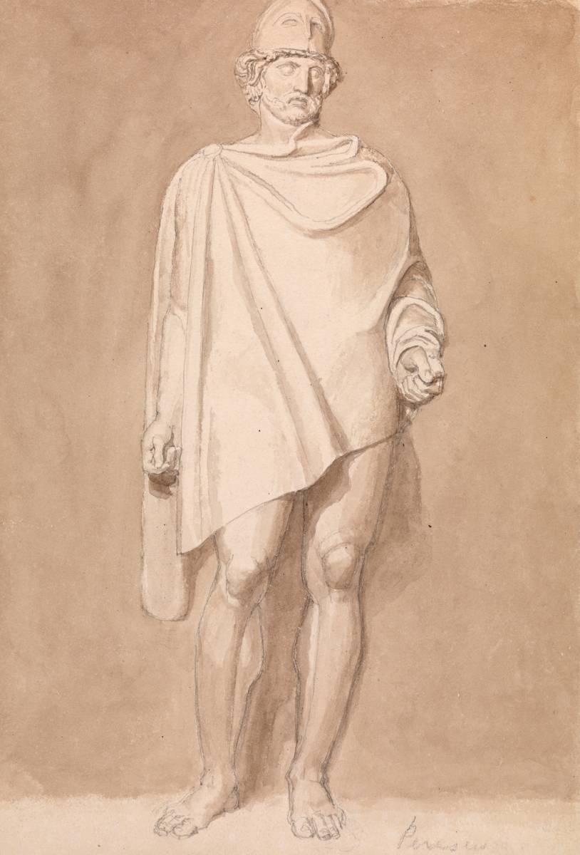 This fascinating study seems to have been made by John Flaxman in about 1800. At the same date Flaxman made a drawing of a famous bust of the Greek statesman Pericles from the collection of Charles Townley. Flaxman’s drawing was engraved by William Blake and used to illustrate William Hayley’s Essay on Sculpture published in 1800. Flaxman’s wash drawing of Pericles shows the full-figure, based on a sculpture in the Museo Pio-Clementino at the Vatican, but possibly partly based on Charles Townley’s bust. Numerous studies after notable antiquities by Flaxman survive – Townley himself owned several drawings after antique sculpture by Flaxman – and the precise purpose of this finely worked wash drawing is not entirely clear. Worked in pencil and then ink, this drawing is a demonstration of Flaxman’s intense interest in the antique.