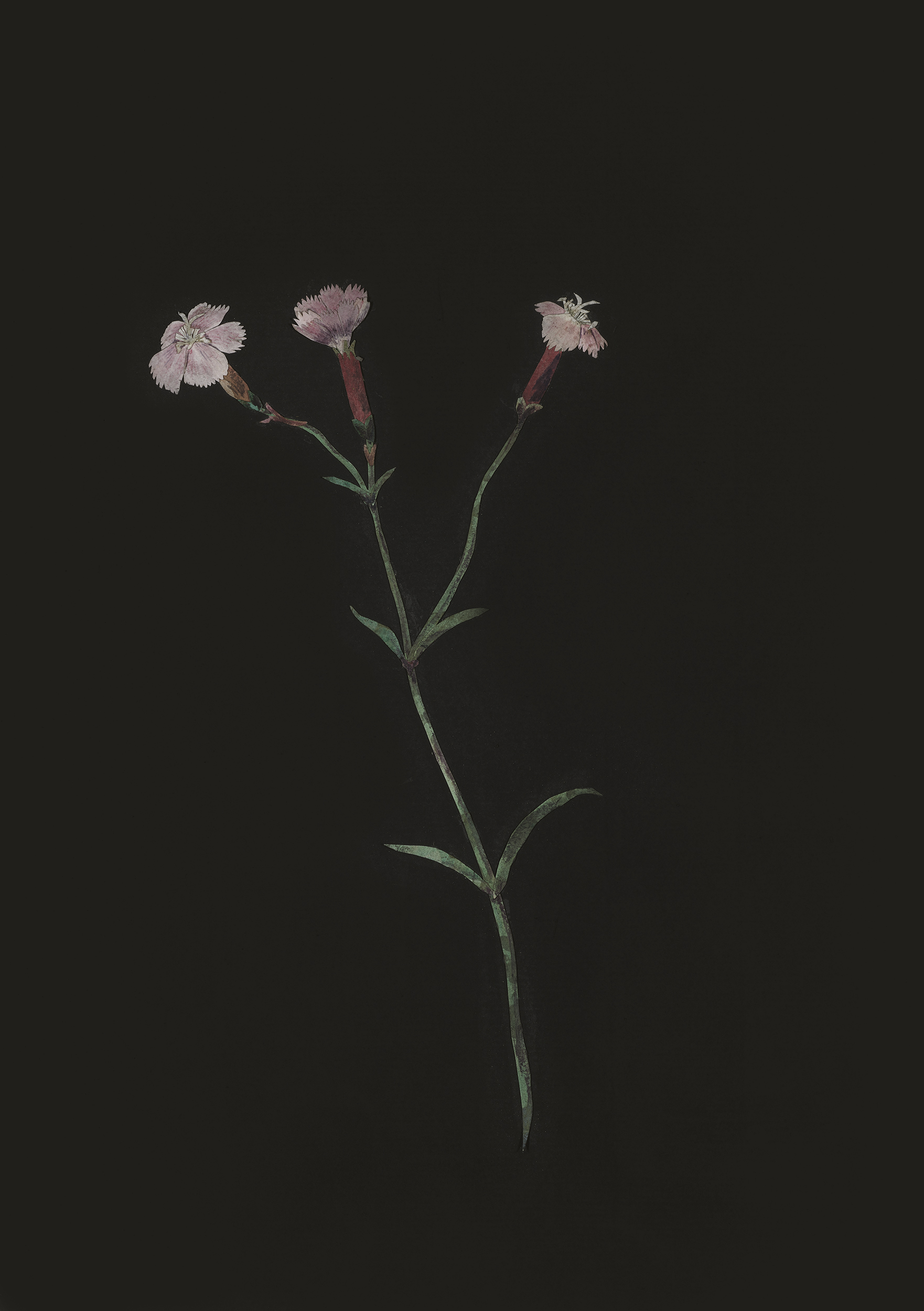 Grey’s collages show that he was clearly familiar with Delany’s technique. We know Delany had students, including a Miss Jennings: ‘a sensible agreeable, and ingenious woman a pupil of mine in the paper mosaick work’, several of Delany’s late collages are inscribed as having been completed by Jennings. Grey we know was a talented artist, he engraved a series of prints, bound sets of which survive in several collections.[2] The present specimen shows both intimate knowledge of Delany’s innovative technique and remarkable dexterity. The Dianthus is constructed with finely cut pieces of paper, coloured with watercolour and carefully stuck on a sheet of paper painted black. The precision, technique and positioning of the flower on the page all suggest that Grey was taught by Delany herself.