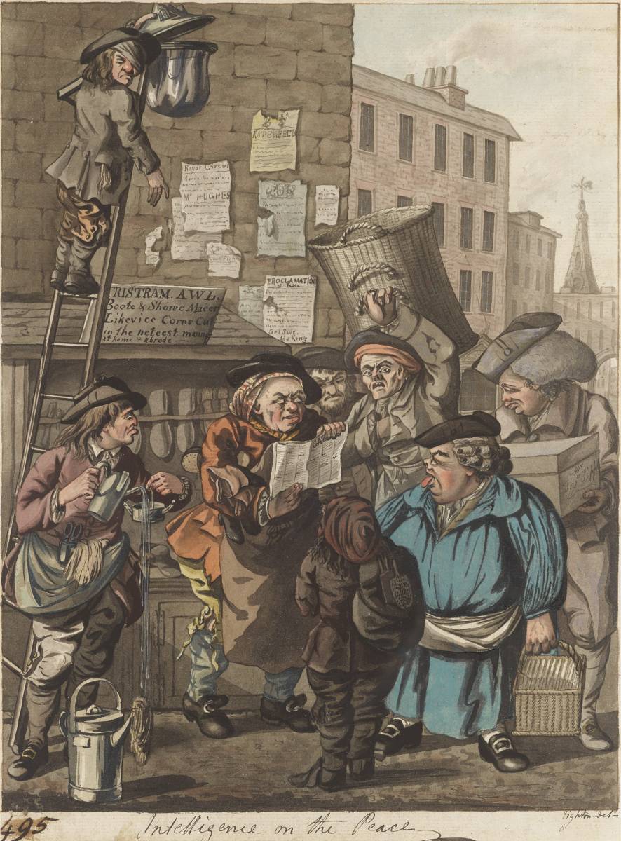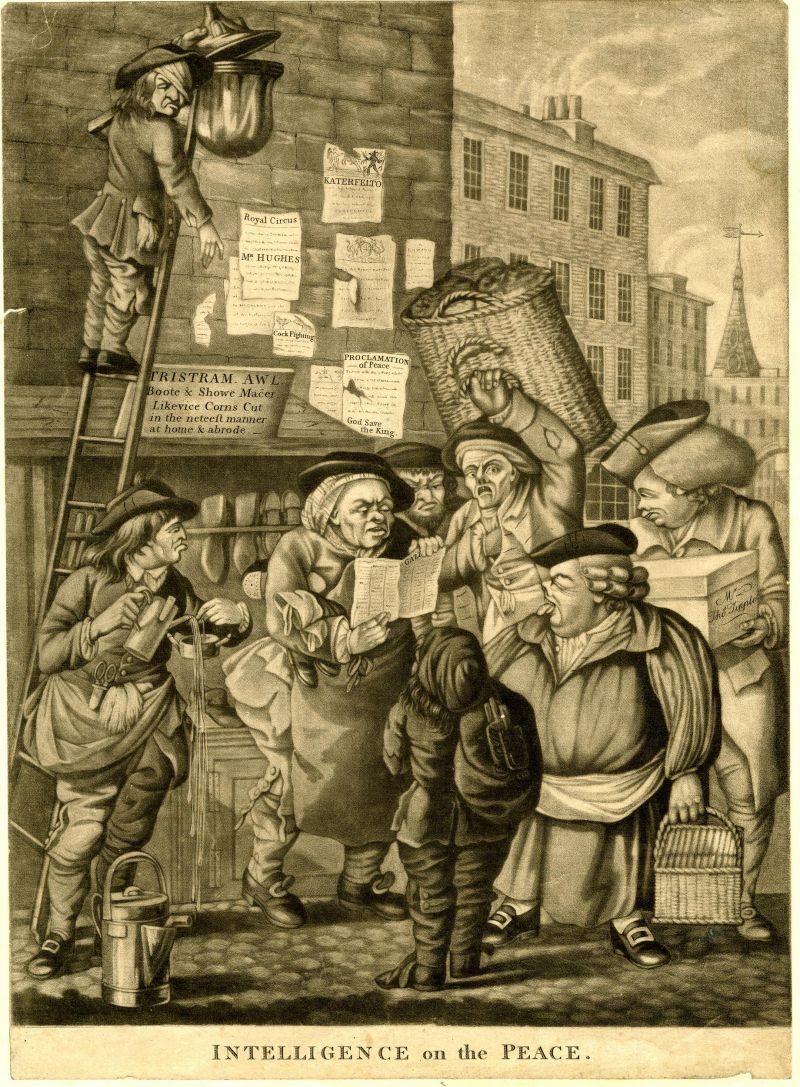 This humorous drawing was made by Robert Dighton for the publisher Carington Bowles, it shows a group of London working men reading the report of the Proclamation of Peace between Britain and America at the end of the American Revolutionary War. Dighton’s print was published with the title ‘Intelligence on the Peace’ and his satire explores the familiar trope of tradesmen neglecting their work to discuss the politics of the day. The London Gazette containing the announcement that peace had been signed was that of September 6-9 1783. Peace was formally proclaimed in London on 6 October, after which the proclamation was ‘stuck up in divers parts.’ Dighton shows a cobbler, identifiable from his trade sign as Tristram Awl, reading the gazette to a small crowd consisting of a lamplighter, baker, cutler, sweep and barber. Dighton makes these recognisable types, red faced and faintly grotesque; the title of the print giving a clue to the satire at work. It is clear that the debate over the future relationship between North America and Britain is far from ‘intelligent’ and that it is the subject of derision from the illiterate men. This was a trope Dighton explored in other cartoons of the period and was clearly a satire which Bowles found popular with his largely urban, middle-class clientele.