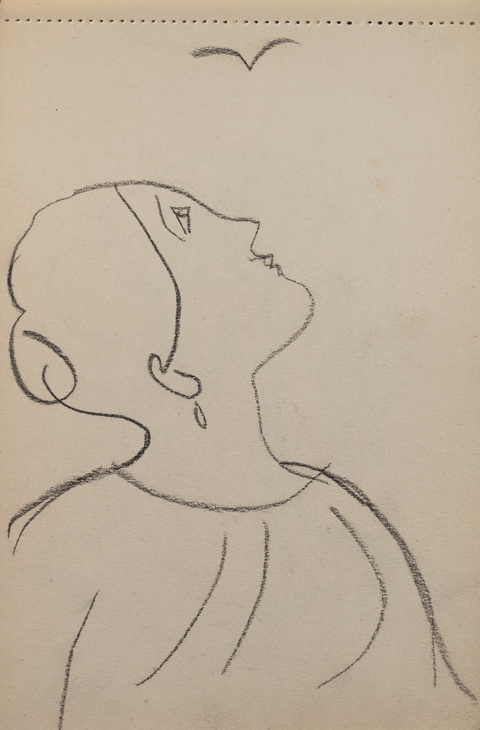 This intimate pocket sketchbook was used by Vanessa Bell on a trip to Paris in 1921. Bell regularly used these, small sketchbooks to record what she saw as she travelled. On this trip, Bell was accompanied by Duncan Grant and their three-year old daughter, Angelica and the sketchbook contains a series of intimate studies of the young Angelica. Bell regularly visited Paris, in the previous year, travelling with Grant and Maynard Keynes, she had met Picasso, noting: ‘he showed us quantities of his latest works the things he is actually at work on, nearly all more or less abstract designs though I suppose usually suggested by nature. Some were amazingly beautiful. I think all gave one very definite sensations and he was interested to find out whether they were the ones he wanted to produce.’[1] Bell regularly met other contemporary artists in France, including André Derain, Georges Braque and Erik Satie.