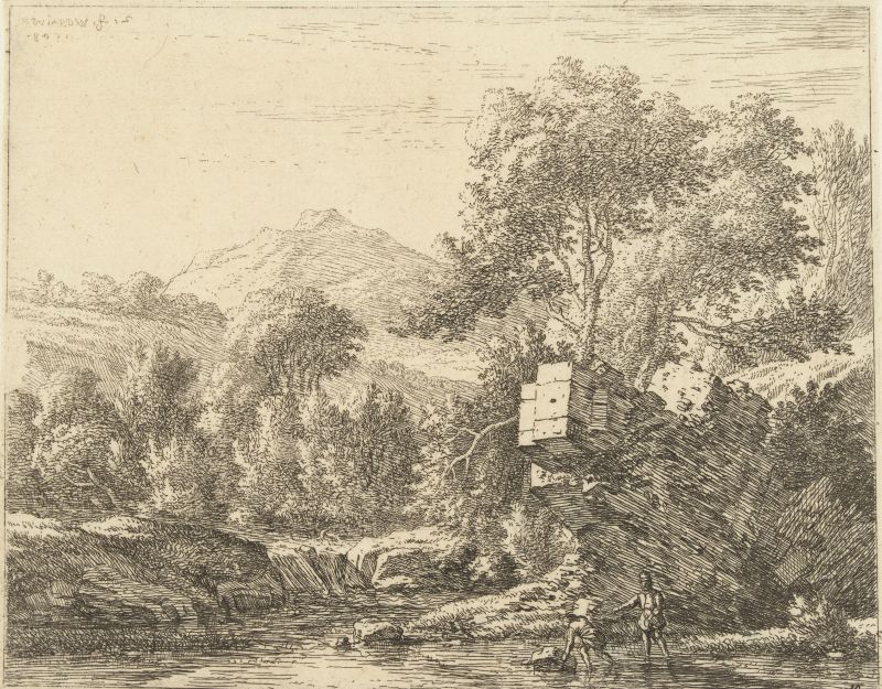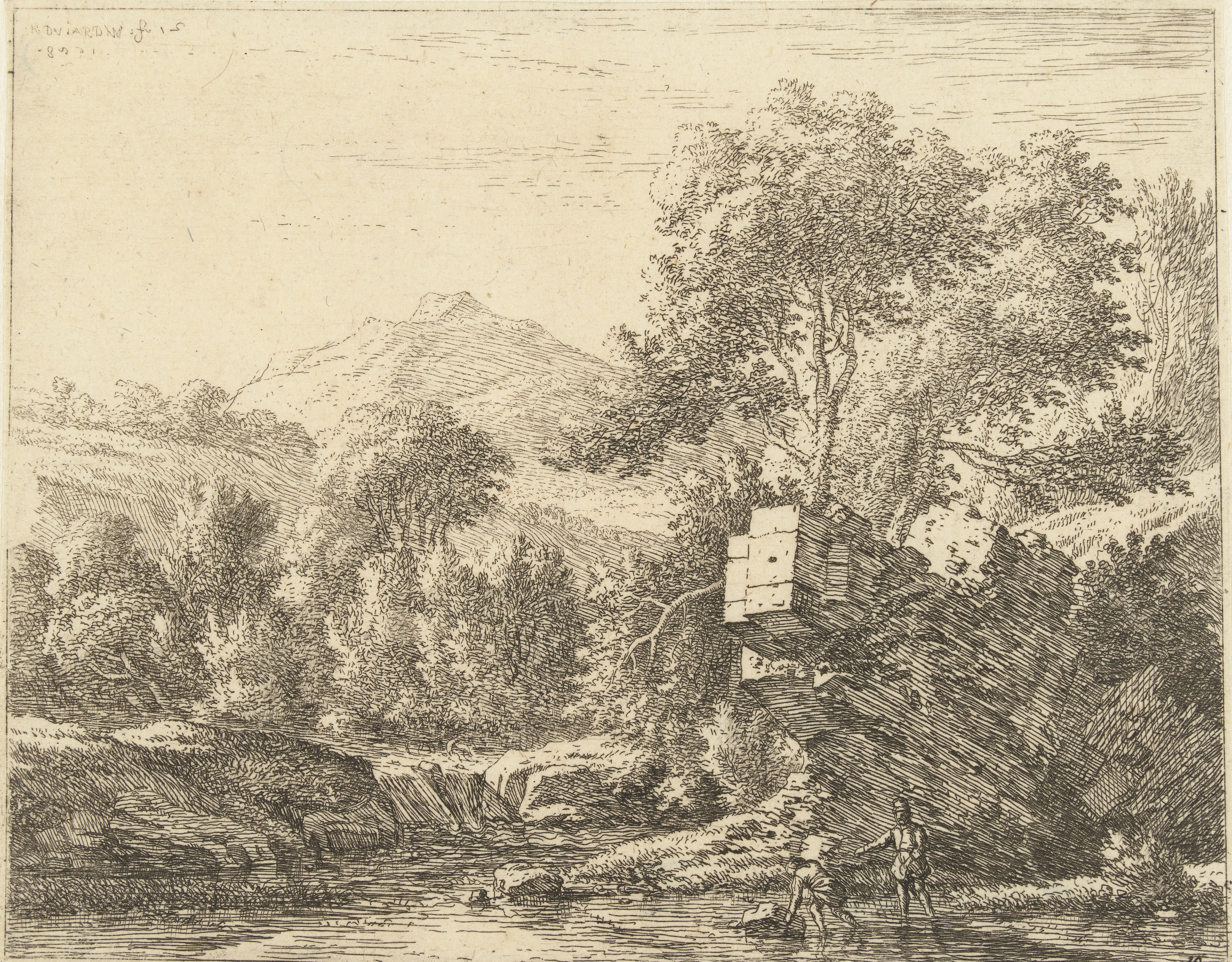 At this date, Gainsborough’s landscapes were inflected by his interest in seventeenth-century Dutch art. Gainsborough had a relationship with a dealer, Panton Betew, who made a living selling modern imitations of Dutch seventeenth-century landscape paintings.[2] During his training Gainsborough took part in the associated practices of the dealer restoring and ‘improving’ Dutch paintings; the 1762 sale of John Oldfield’s collection includes a ‘Dutch Landscape, repaired by Mr Gainsborough’ and a painting by ‘Wijnants the figures by Mr Gainsborough’.[3] The access to genuine Dutch landscapes of the seventeenth century offered a supplement to the young Gainsborough’s formal training. This exposure evidently stimulated his activity as a painter producing landscape compositions heavily indebted to seventeenth-century models.[4] These were the paintings that Gainsborough would later refer to as ‘my first imitations of little Dutch Landskips.’[5] The present drawing shows a wooded bank, with a partially concealed ruined castle, an open landscape traversed by a rutted, waterlogged track, cattle and a solitary herdsman. In its form and content this landscape recalls the work of Meindert Hobbema or Jan Wijnants.