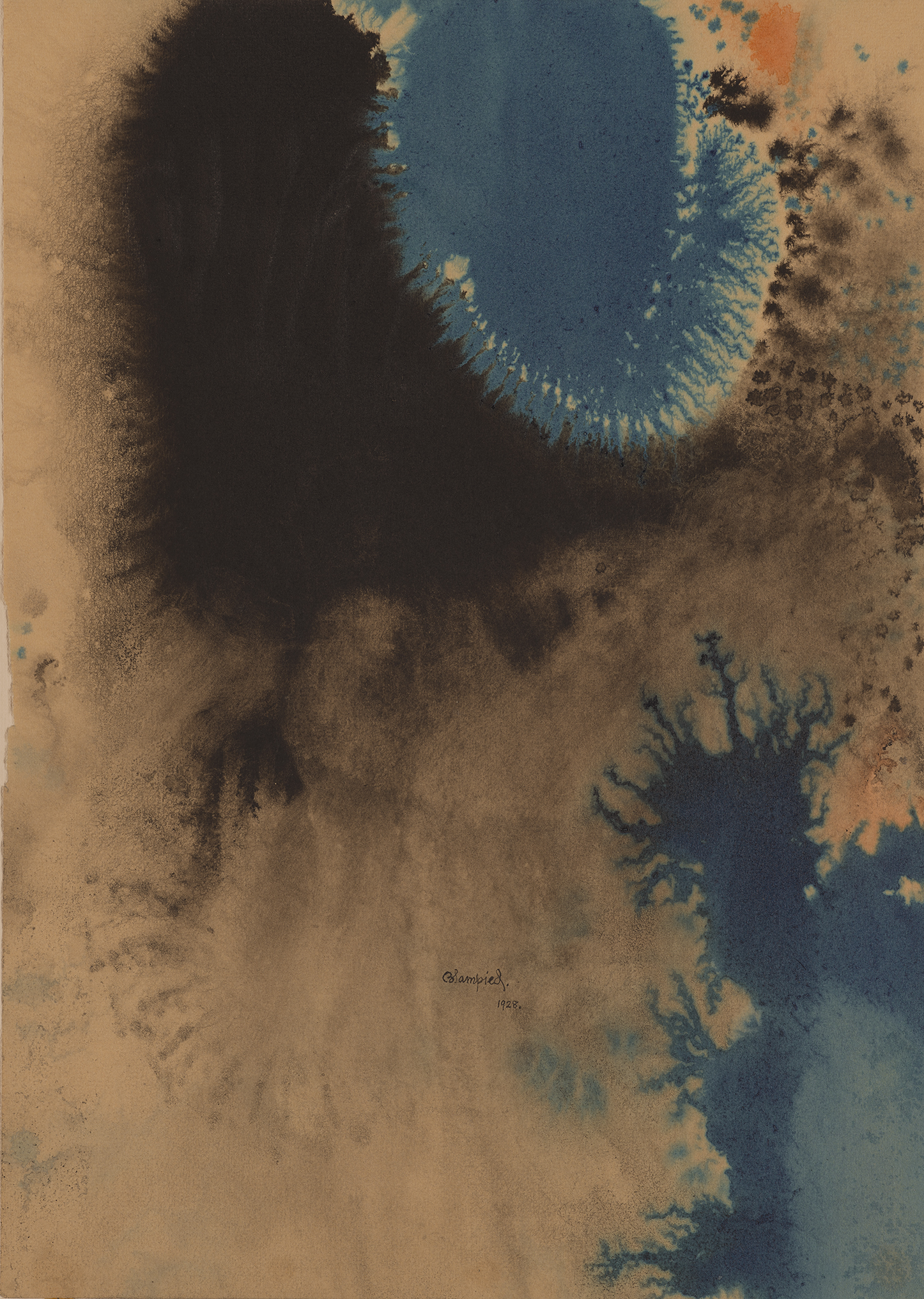 Whilst completely abstract, the sheets are not wholly organic or accidental. Blampied has clearly manipulated the paper to cause liquid paint to run in different directions; added inks of differing viscosity and density and introduced a careful range of colours. Most of the sheets are carefully signed and dated by Blampied indicating their orientation and underscoring their status as completed art works. The title Blampied gave the works when he exhibited them in New York in 1932 ‘Colour Symphonies’ suggests a powerful analogy with music, a trope that was being actively pursued by European abstract artists at this date. We know that at least one Blampied ‘Colour Symphonies’ was sold at the New York exhibition in 1932, it was acquired by Moore Achenbach (1878-1963) and is now in the collection of the Achenbach Foundation for Graphic Arts at the Legion of Honor in San Francisco.