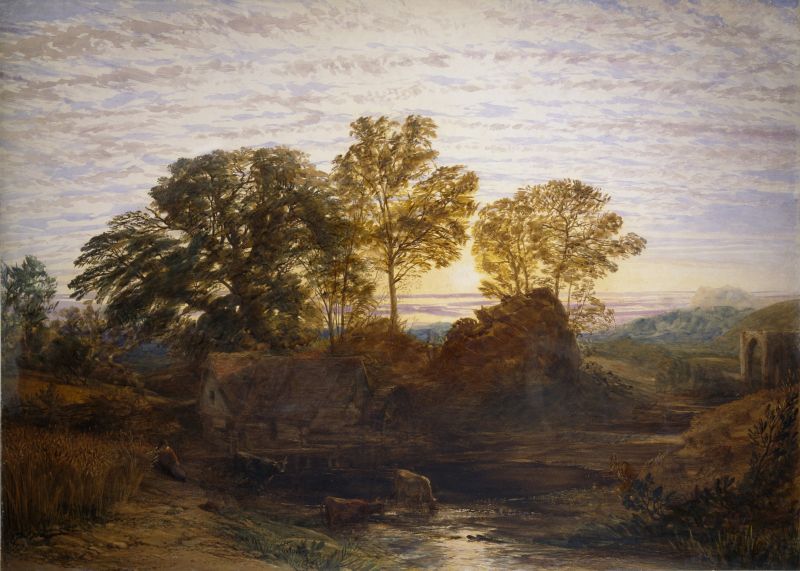 Following the return to Britain from his Italian honeymoon in 1839, Palmer concentrated on establishing his reputation, both critical and commercial. He did so by producing richly worked watercolours inspired by his travels in Britain and Italy. In 1843 Palmer was elected an associate member of the Old Watercolour Society. As William Vaughan has pointed out, his election had a profound influence on the work he produced, moving him away from oil painting and the complex world of the Royal Academy. In the face of stiff competition in the exhibiting societies, Palmer developed a distinctive and easily recognizable panoramic format, known as his ‘little-long’, filling these intensely worked watercolours with pyrotechnic lighting effects. In this way, his exhibited watercolours differed from many of his most successful contemporaries, who delighted in the broad, washes of watercolour, Palmer by contrast produced jewel-like works. Palmer himself noted to the critic P. G. Hamerton that he became ‘a water-worker only by accident’, his own preference being for: ‘water-colour as it appears in tempera and, on a small scale, in the old missals.’ In this way, Palmer’s exhibited watercolours have something of the enamelled quality of illuminated manuscripts.