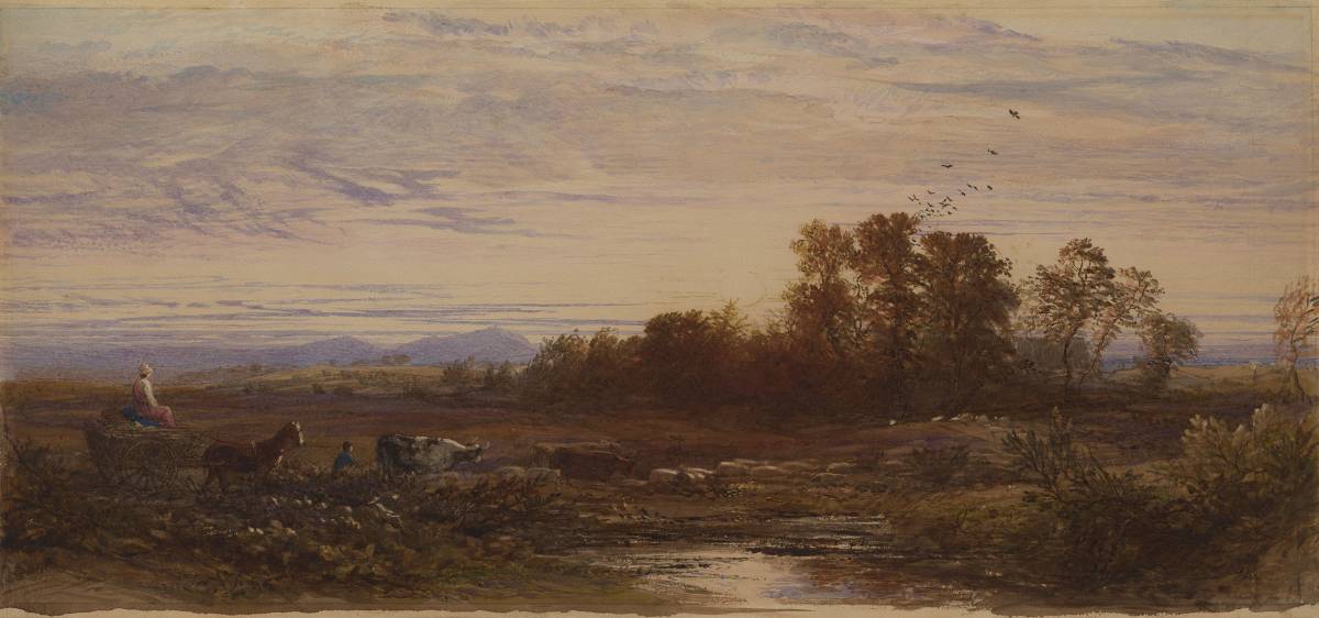 This beautifully wrought, carefully finished watercolour was exhibited by Samuel Palmer at the Society of Painters in Water Colours in 1848. Titled Crossing the Common – Sunset, the subject-matter presents a neat distillation of the themes that drove Palmer’s work throughout his career. The panoramic format, richly worked in watercolour shows a peaceable, productive landscape at the close of day, in the foreground a wagon and herdsman return home along a limpid river, the sun is setting behind a distant stand of trees illuminating the sky with a vivid lilac sunset. Preserved in exceptional condition, this luminous watercolour is a fine example of a middle-period exhibition work, which was acquired in 1848 by the Bishop of Winchester, Charles Sumner.