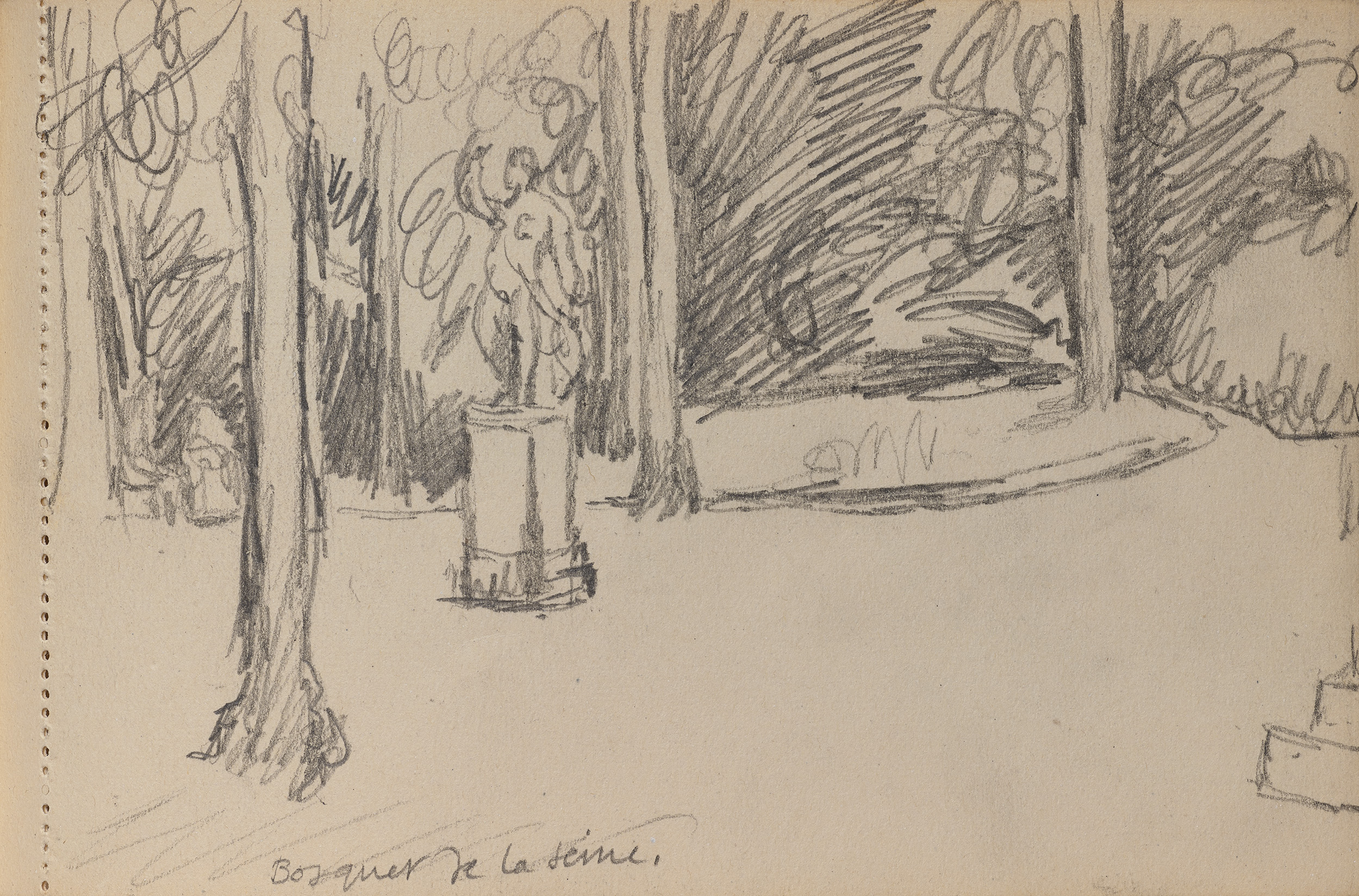 This sketchbook can be read as a visual notebook, capturing scenes Bell saw in the city: walks along the Seine, glimpsing the river under bridges and in the gardens at Versailles. Bell makes studies of figures she sees, a sequence of candid sketches of Angelica, fragments of still life, observations of her own hand and fluid line drawings which echo the artists she encountered. We know that Bell and Grant again met Picasso in Paris, and some of Bell’s incisive line drawings perhaps show her awareness of new directions in French art. A study of a seated nude from behind, immediately recalls the large, classical nudes that Picasso was working on at this moment. Bell wrote of seeing ‘an astonishing painting of two nudes most elaborately finished and rounded’ noting also that she had seen ‘a magnificent large nude by Matisse.’[2] The sketchbook is also filled with notations, addresses and a list of expenses that Bell and Grant had incurred on their travels, it therefore acts as a highly personal resource, offering a fascinating insight into both the artist at work and a woman abroad.