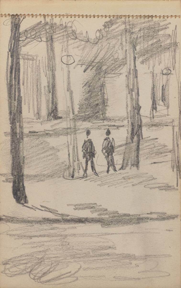 This intimate pocket sketchbook was used by Vanessa Bell on a trip to Paris in 1921. Bell regularly used these, small sketchbooks to record what she saw as she travelled. On this trip, Bell was accompanied by Duncan Grant and their three-year old daughter, Angelica and the sketchbook contains a series of intimate studies of the young Angelica. Bell regularly visited Paris, in the previous year, travelling with Grant and Maynard Keynes, she had met Picasso, noting: ‘he showed us quantities of his latest works the things he is actually at work on, nearly all more or less abstract designs though I suppose usually suggested by nature. Some were amazingly beautiful. I think all gave one very definite sensations and he was interested to find out whether they were the ones he wanted to produce.’[1] Bell regularly met other contemporary artists in France, including André Derain, Georges Braque and Erik Satie.