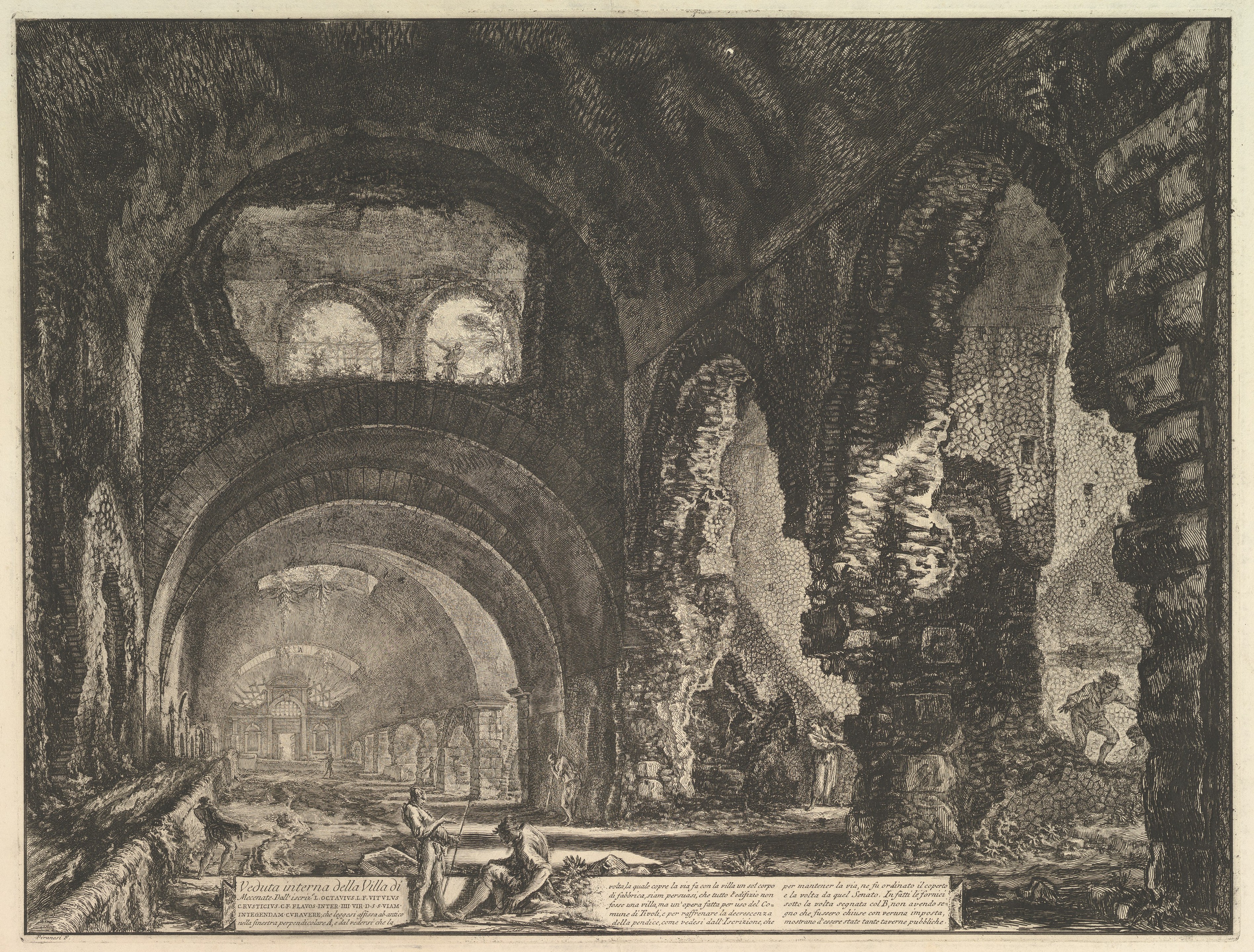 This boldly conceived composition is partly indebted to the work Zucchi completed with Clérisseau, but shows another artistic influence, namely the prints of Giovanni Battista Piranesi. The ambitious scenegraphic view shows the interior of a vaulted space lined with antique sculptural fragments. The overall concept owes something to Piranesi’s dramatic views of the interior arcades of the so-called Villa of Maesenas at Tivoli which he published in a series of etchings in 1764. Piranesi showed the long arcades of the ancient Sancturary of Hercules at Tivoli, then erroneously identified as the villa of Virgil’s great patron, as half ruined and enveloped in vegetation. Like Piranesi, Zucchi has invested his ruins with a Romantic vitality. The grand, vaulted space is slowly succumbing to vegetation and each of the antiquities is shown as a fragment. The arrangement of the space, with bays for sculpture and reliefs set into the walls recalls the neo-classical interiors of Adam and other contemporaries, particularly modern spaces designed to show ancient art, such as Villa Albani or the Museo Pio Clementino. As such, Zucchi’s drawings point to the modernity of the fragment and the ruin in contemporary European architecture and design. Preserved in excellent condition, this late design underscores Zucchi’s importance in the neo-classical circles of Adam, Clérisseau and Piranesi.