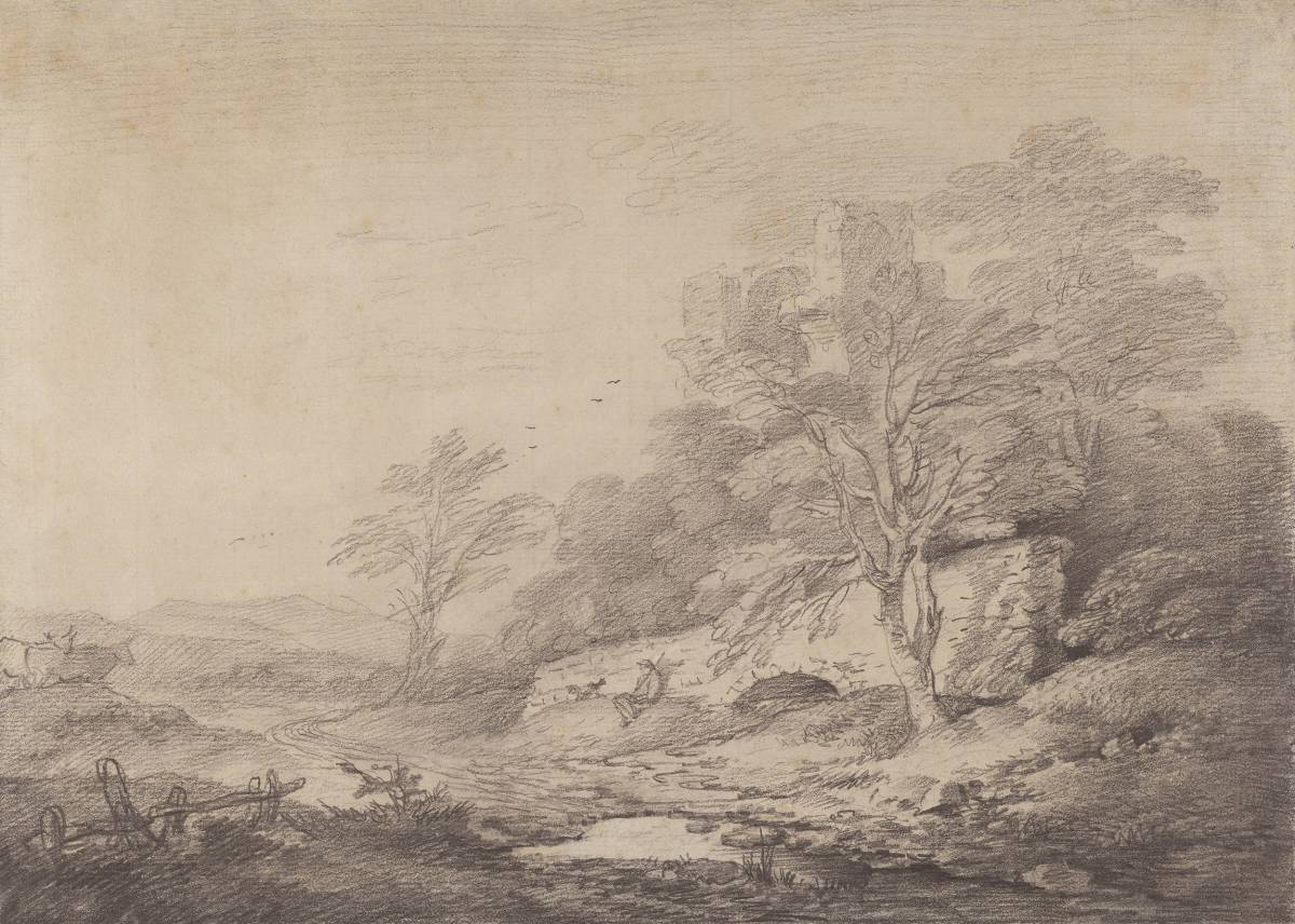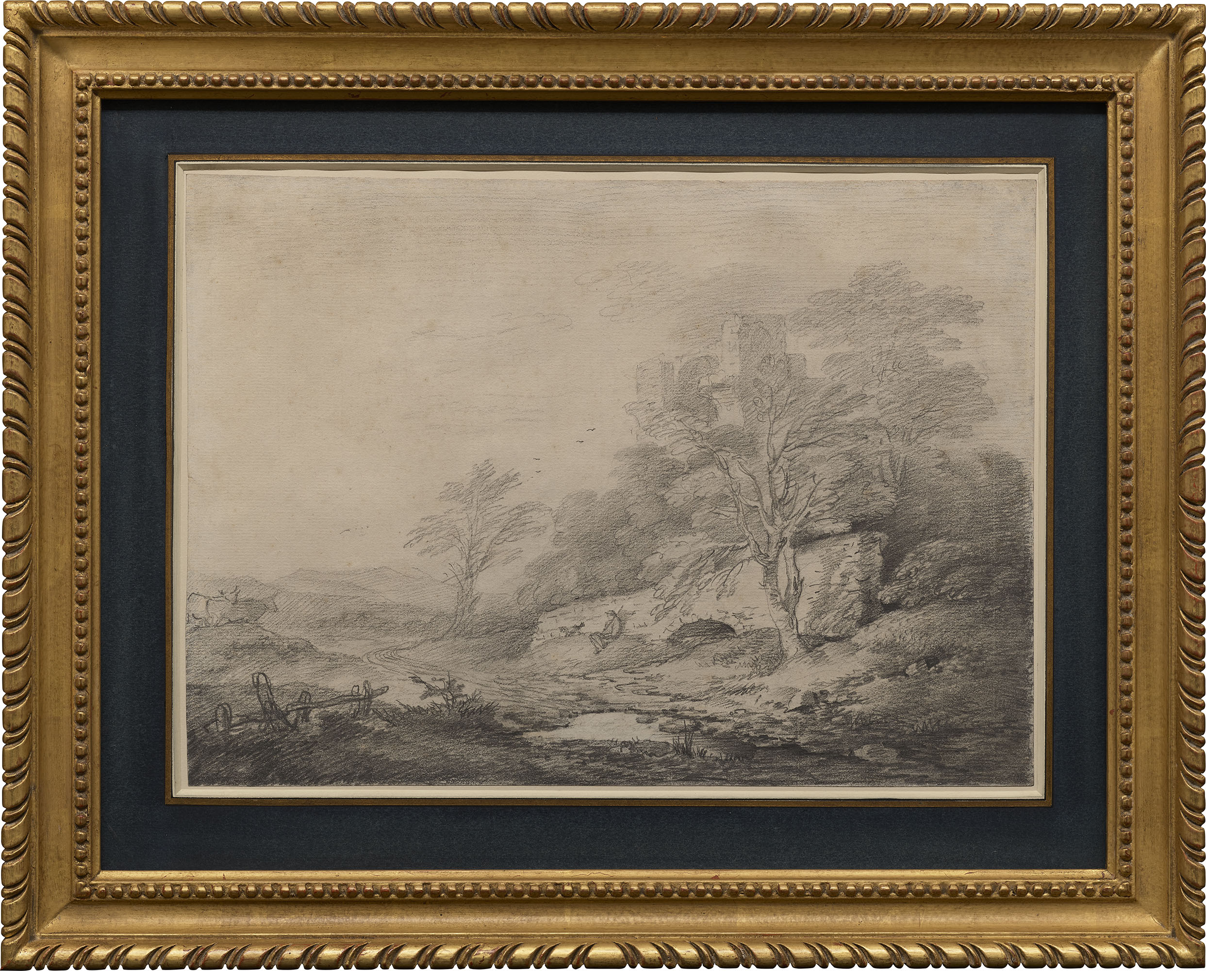 At this date, Gainsborough’s landscapes were inflected by his interest in seventeenth-century Dutch art. Gainsborough had a relationship with a dealer, Panton Betew, who made a living selling modern imitations of Dutch seventeenth-century landscape paintings.[2] During his training Gainsborough took part in the associated practices of the dealer restoring and ‘improving’ Dutch paintings; the 1762 sale of John Oldfield’s collection includes a ‘Dutch Landscape, repaired by Mr Gainsborough’ and a painting by ‘Wijnants the figures by Mr Gainsborough’.[3] The access to genuine Dutch landscapes of the seventeenth century offered a supplement to the young Gainsborough’s formal training. This exposure evidently stimulated his activity as a painter producing landscape compositions heavily indebted to seventeenth-century models.[4] These were the paintings that Gainsborough would later refer to as ‘my first imitations of little Dutch Landskips.’[5] The present drawing shows a wooded bank, with a partially concealed ruined castle, an open landscape traversed by a rutted, waterlogged track, cattle and a solitary herdsman. In its form and content this landscape recalls the work of Meindert Hobbema or Jan Wijnants.